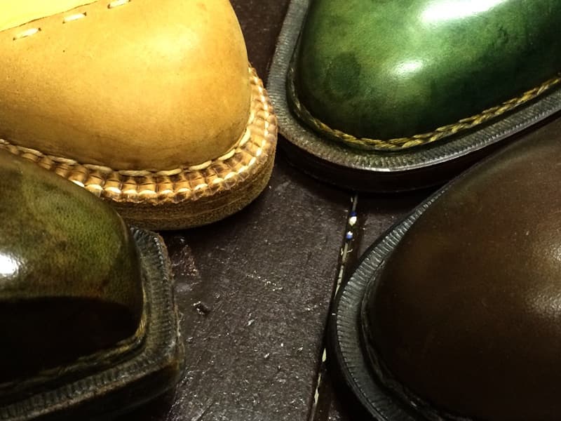 上の写真の3つは同じ木型で作ったものですが、芯の厚み、底付け方法などの違いで見た感じが違います。…違いません?そう言われて見ると違って見えてきませんか…。