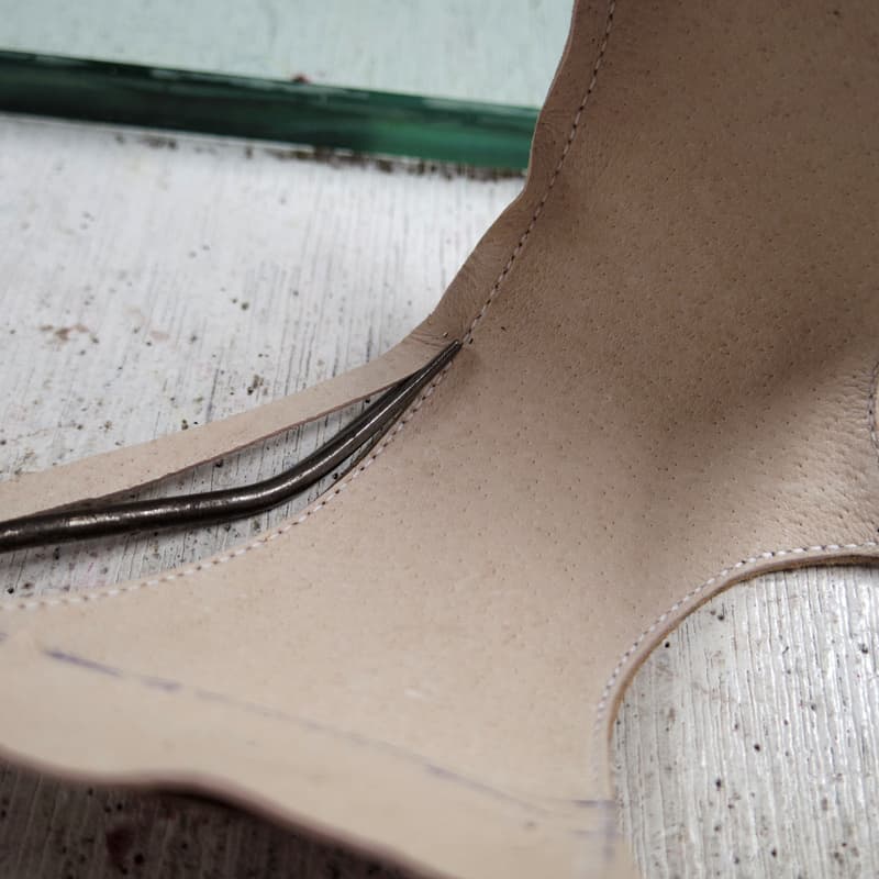 ノルウィージャン製法。アッパーに手縫いのステッチってかっこよくないですか?ボカァ好きです。手縫いの定番ではないですが、ウェルトがない分作りやすいと思います。いかにも手で縫いましたって感じを出せる作りです。中物を入れるスペースはほとんどありません。