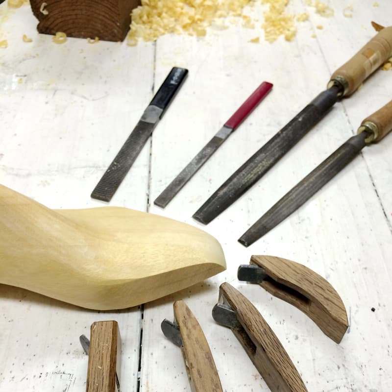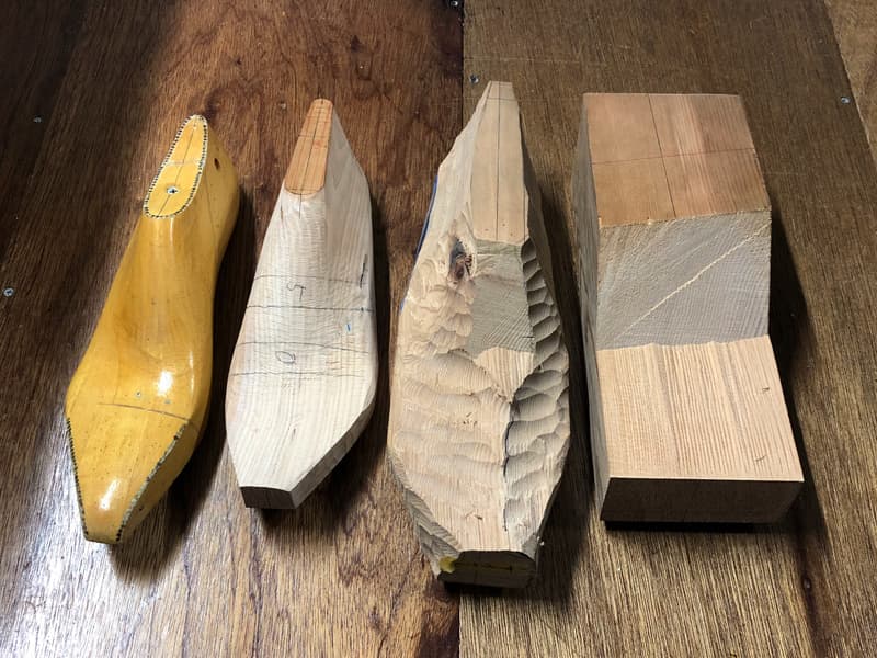 革を靴の形に成形するために使います。当店のフルオーダーはお一人お一人に木型をお作りします。左右の足を採寸し角材を削って木型を作ります。