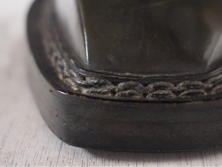 ハンドソーンウェルト製法です。ウェルトと呼ばれる革の部品を靴底に対して平行に縫い付けるので、返り(靴底の屈曲性)があまり悪くなりません。中物(靴底の中のクッション)を入れるスペースはやや少なめです。